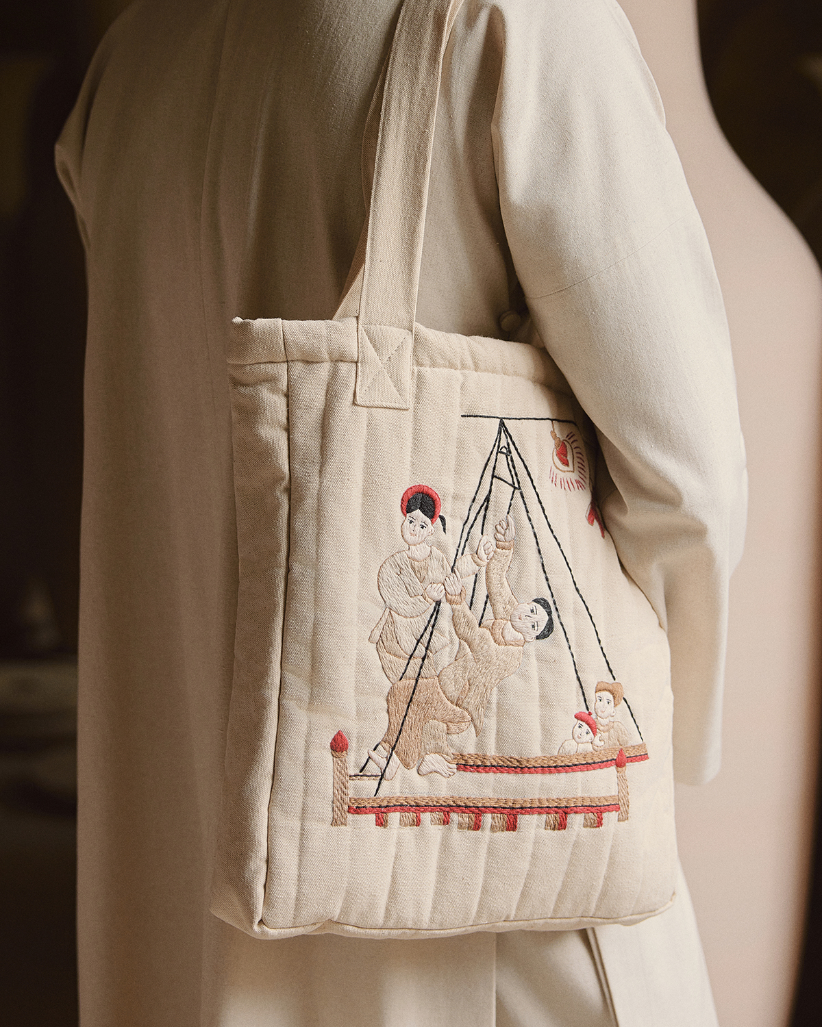 Chất liệu: Linen chần bông Màu sắc: Muối tiêu Họa tiết: Thêu tay thủ công hoạ tiết tranh “Đánh đu”